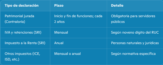 • Declaraciones de impuestos específicos (ICE, ISD, etc.).